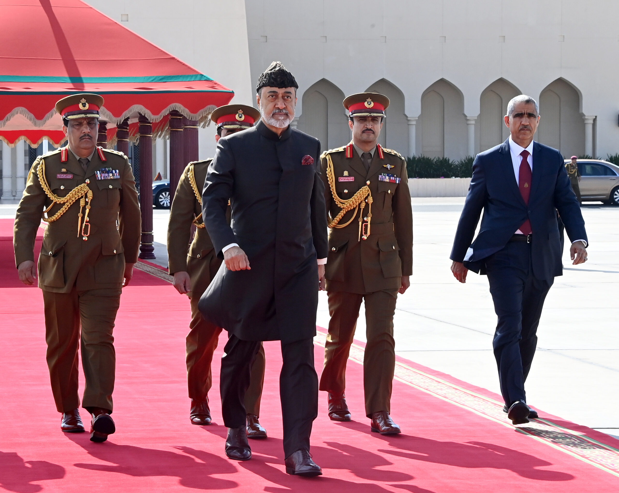ويرافق حضرةَ صاحبِ الجلالةِ السُّلطان المعظم /أيّدهُ اللهُ/ خلال زيارته وفدٌ رسميٌّ رفيعُ المستوى يضم كلًّا من صاحبِ السُّمو السّيد شهاب بن طارق آل سعيد نائبِ رئيس الوزراء لشؤون الدفاع، ومعالي السّيد خالد بن هلال البوسعيدي وزير ديوان البلاط السُّلطاني، ومعالي الفريق أول سُلطان بن محمد النعماني وزير المكتب السُّلطاني، ومعالي السّيد بدر بن حمد البوسعيدي وزير الخارجية، ومعالي الدكتور حمد بن سعيد العوفي رئيس المكتب الخاصّ، ومعالي عبد السّلام بن محمد المرشدي رئيس جهاز الاستثمار العُماني، ومعالي المهندس سالم بن ناصر العوفي وزير الطاقة والمعادن وسعادة السّفيرة رؤى بنت عيسى الزدجالية سفيرة سلطنة عُمان المعتمدة لدى مملكة بلجيكا.