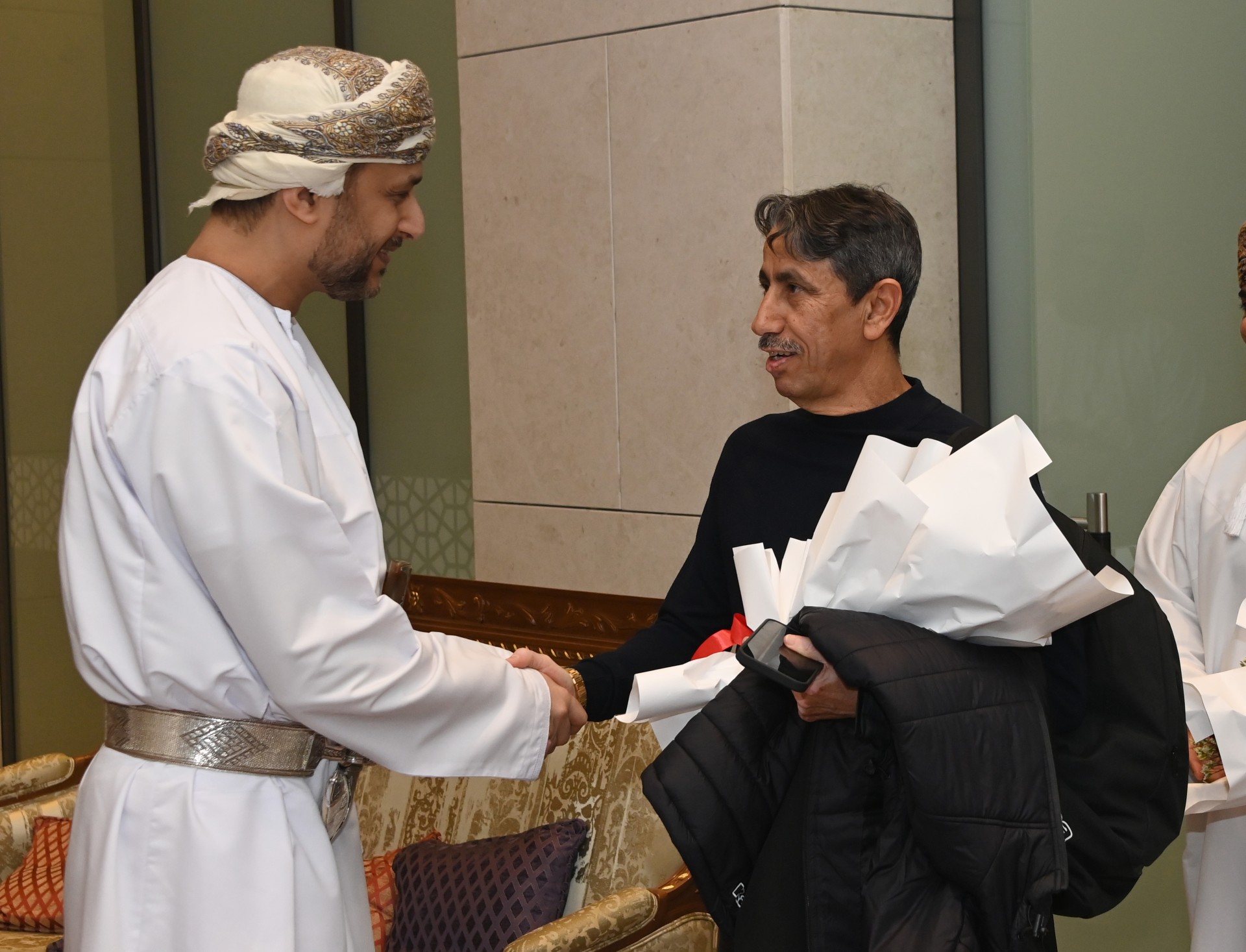 وكان في استقبال البعثة في قاعة كبار الشخصيات بمطار مسقط الدولي سعادة باسل بن أحمد الرواس وكيل وزارة الثقافة والرياضة والشباب للرياضة والشباب.