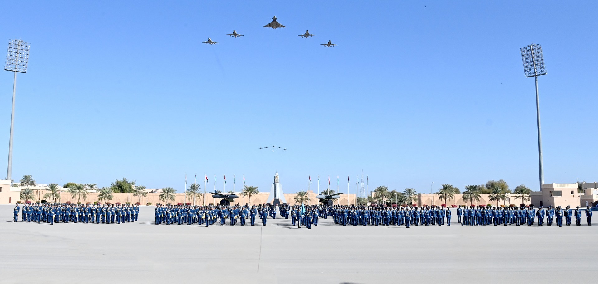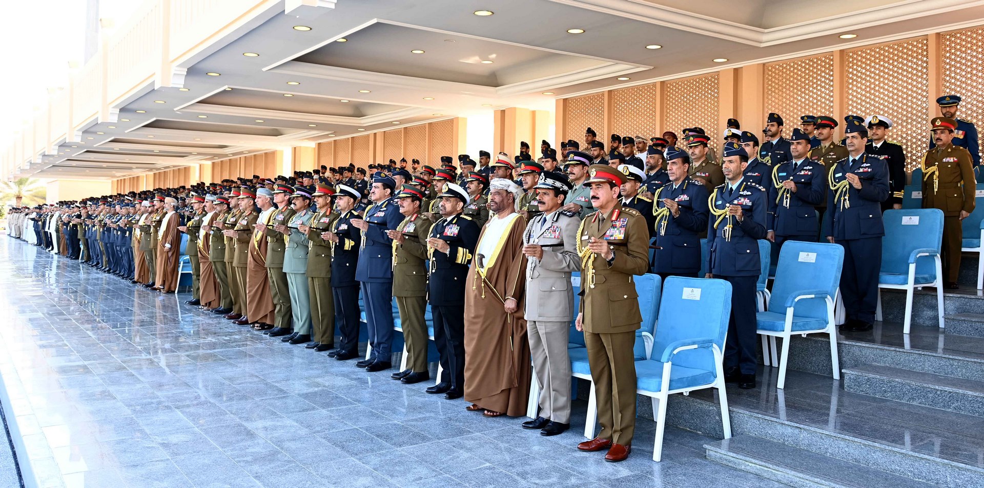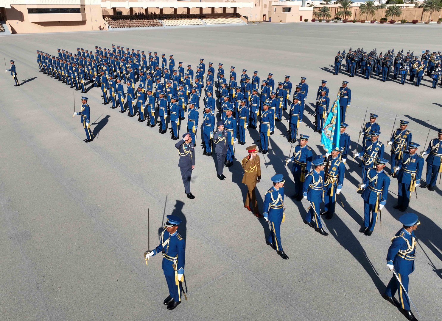 ثم جرت مراسم تسليم وتسلم راية أكاديمية السلطان قابوس الجوية من الدورة المتخرجة إلى الدورة التي تتلقى تدريبها حاليًا بأكاديمية السلطان قابوس الجوية، والتي أقسم منتسبوها على صونها والمحافظة عليها، ثم أنشد الضباط الخريجون نشيد سلاح الجو السلطاني العُماني، وأدّوا قسم الولاء ونداء التأييد، وهتفوا ثلاثًا بحياة حضرة صاحب الجلالة السلطان هيثم بن طارق المعظم القائد الأعلى ـ حفظه الله ورعاه ـ ثم قدمت عدد من الطائرات المقاتلة بسلاح الجو السلطاني العُماني استعراضًا جويًّا في سماء ميدان الاحتفال، تجسيدًا لما تحقق لسلاح الجو السلطاني العُماني من تحديث وتطوير في قدراته التسليحية والتدريبية والبشرية، وما يحظى به من رعاية واهتمام ساميين، بعدها عزفت فرقة الموسيقى السلام السلطاني.