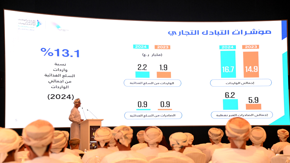 وفيما يتعلق بمساهمة قطاع الغذاء والمياه في الناتج المحلي الإجمالي أشار إلى أن القيمة المضافة لقطاع الغذاء بلغت في عام 2024 نسبة 3.5 بالمائة بقيمة 1,426 مليون ريال عُماني مقارنة بنسبة 3.2 بالمائة في عام 2023 بقيمة 1,314 مليون ريال عُماني، كما بلغت القيمة المضافة لنشاط الزراعة والإنتاج الحيواني في عام 2024 نسبة 1.5 بالمائة بقيمة 604 ملايين ريال عُماني مقارنة بنسبة 1.4 بالمائة في عام 2023 بقيمة 559 مليون ريال عُماني، فيما بلغت القيمة المضافة لنشاط صيد الأسماك في عام 2024 نسبة 1.1 بالمائة بقيمة 469 مليون ريال عُماني مقارنة بنسبة 1 بالمائة بقيمة 428 مليون ريال عُماني في عام 2023.
