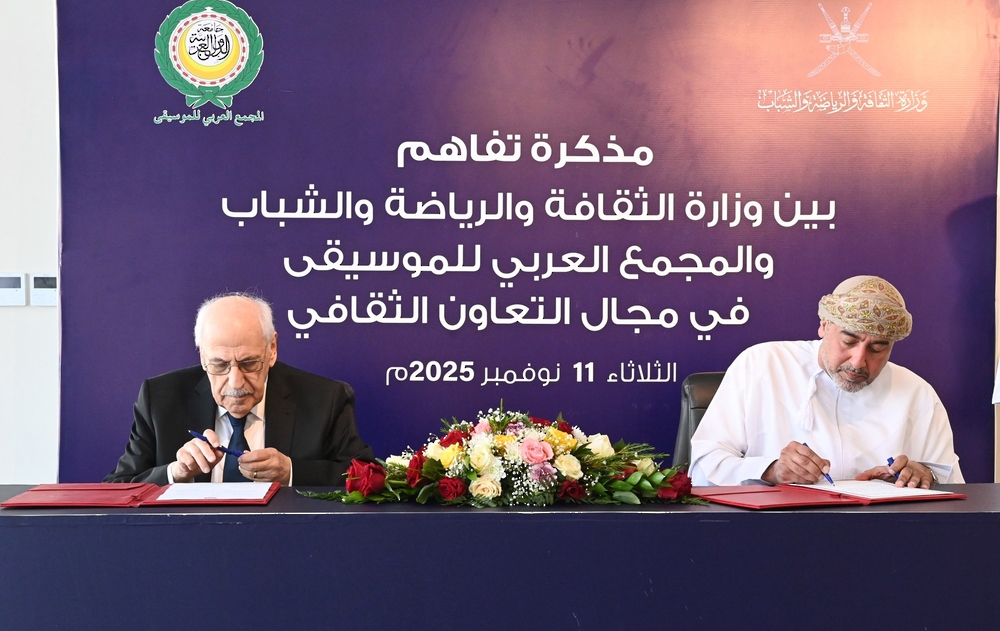 مسقط في 11 نوفمبر /العُمانية/ وقعت وزارة الثقافة والرياضة والشباب اليوم مذكرة تفاهم مع المجمع العربي للموسيقى التابع لجامعة الدول العربية، لتعزيز وتطوير التعاون الثقافي بين الجانبين في مجالات الموسيقى والغناء والفنون الشعبية.