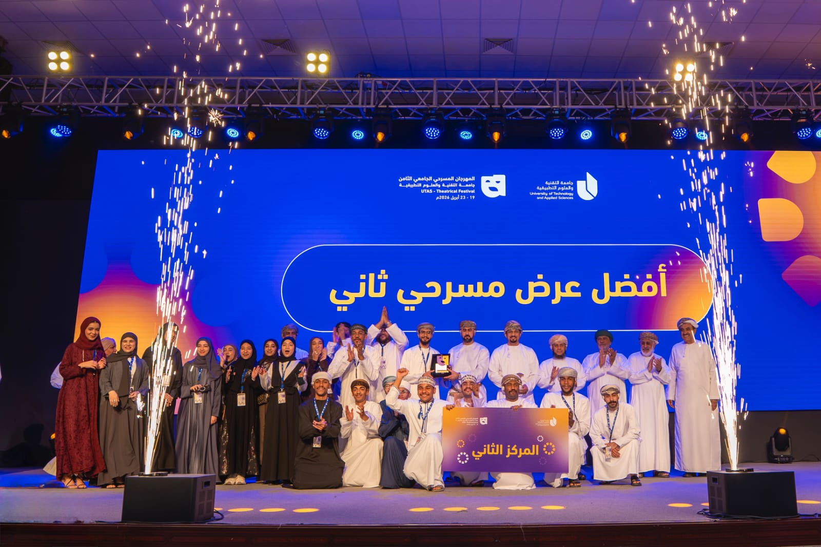اختُتمت بجامعة التقنية والعلوم التطبيقية بنزوى فعالياتالمهرجان المسرحي الجامعي الثامن، الذي أُقيم خلال الفترة من 19 إلى 23 أبريل 2026، تحت رعاية الدكتور محمد بن راشد بن حمدان المعمري، مساعد رئيس الجامعة بفرع نزوى، وبحضور عدد من المسؤولين والأكاديميين والمختصين في الشأن المسرحي، إلى جانب نخبة من الفنانين والمهتمين بالحراك الثقافي والفني.