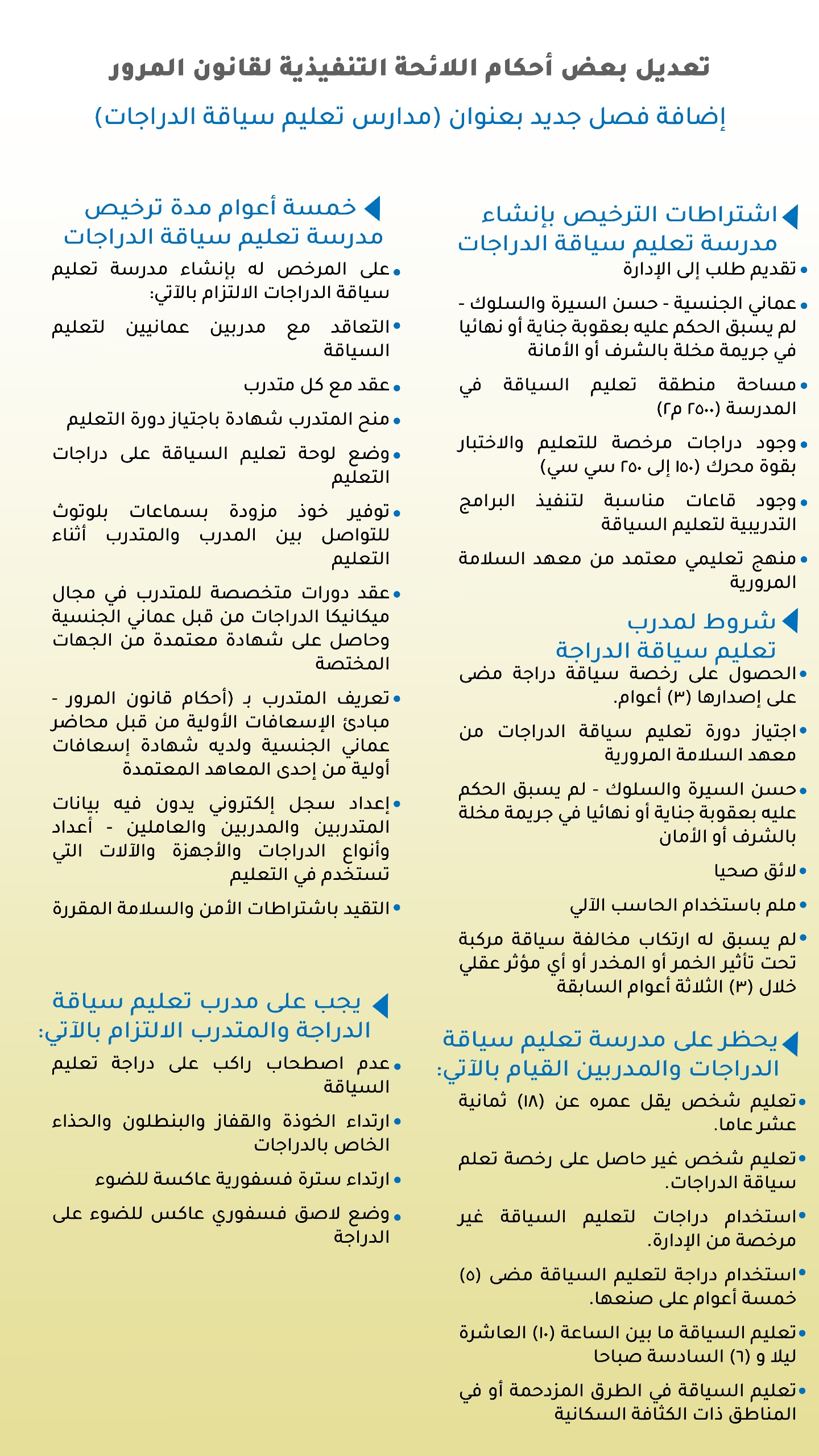 على المرخص له بإنشاء مدرسة تعليم سياقة الدراجات الالتزام بالآتي: