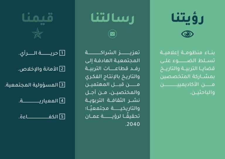 جاءت انطلاقة المجلة في عام 2017م بهدف استقطاب أقلام وطنية وعربية رائدة في مجالات التربية والتاريخ، تسعى لتقديم لبنات أفكارهم بحيث نقدم رؤية حديثة، تدعم القارئ وتوجه فكره نحو التنوير والحداثة، بحيث نصنع فكرًا تربويًا فاعلًا، ونشجع على المبادرات الوطنية، ونسعى إلى نشر الأفكار والمشاريع التربوية والوطنية التي استطاعت أن تحقق إنتاجًا وعملًا رائدًا، بحيث نكون جزءًا فاعلًا وإيجابيًا من منظومة العمل الوطني.